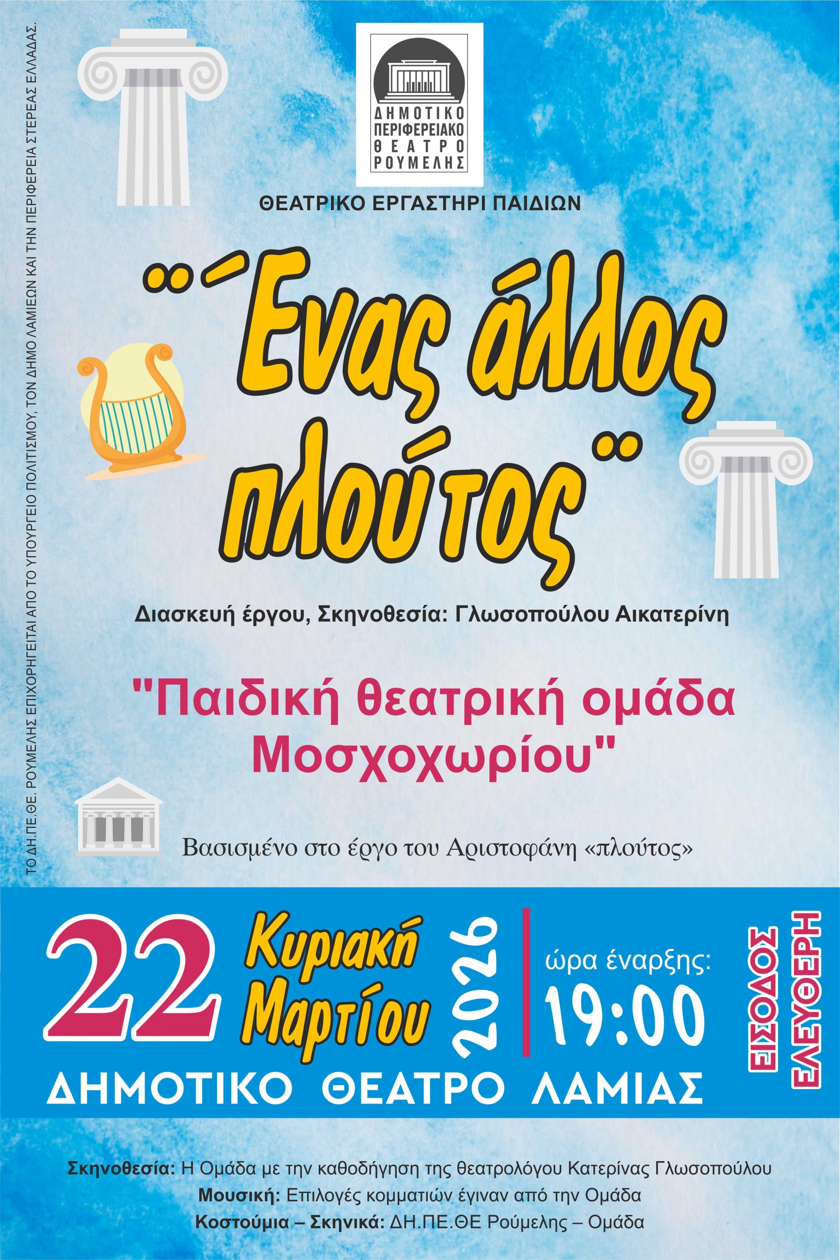 Το Δημοτικό Περιφερειακό Θέατρο Ρούμελης και η Παιδική Θεατρική Ομάδα Μοσχοχωρίου, παρουσιάζoυν τη θεατρική παράσταση «Ένας άλλος πλούτος», σε διασκευή και σκηνοθεσία της Αικατερίνης Γλωσοπούλου. Μια ακόμα παράσταση του Θεατρικού Εργαστηρίου για παιδιά του ΔΗ.ΠΕ.ΘΕ. Ρούμελης, που είναι βασισμένη στο κλασικό έργο