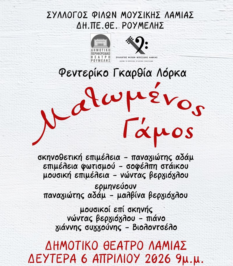 Ημερομηνία Δευτέρα, 9 Μάρτιος, 2026 - 19:30 Ολοκλήρωση στις Δευτέρα, 9 Μάρτιος, 2026 - 21:30 Το Δημοτικό Περιφερειακό Θέατρο Ρούμελης σε συνδιοργάνωση με τον Εξωραϊστικό & Εκπολιτιστικό Σύλλογο Γυναικών Λαμίας και τη Σχολή Πιάνου Λαμίας, παρουσιάζουν ένα μοναδικό αφιέρωμα σε Ελληνίδες στιχουργούς και συνθέτριες,