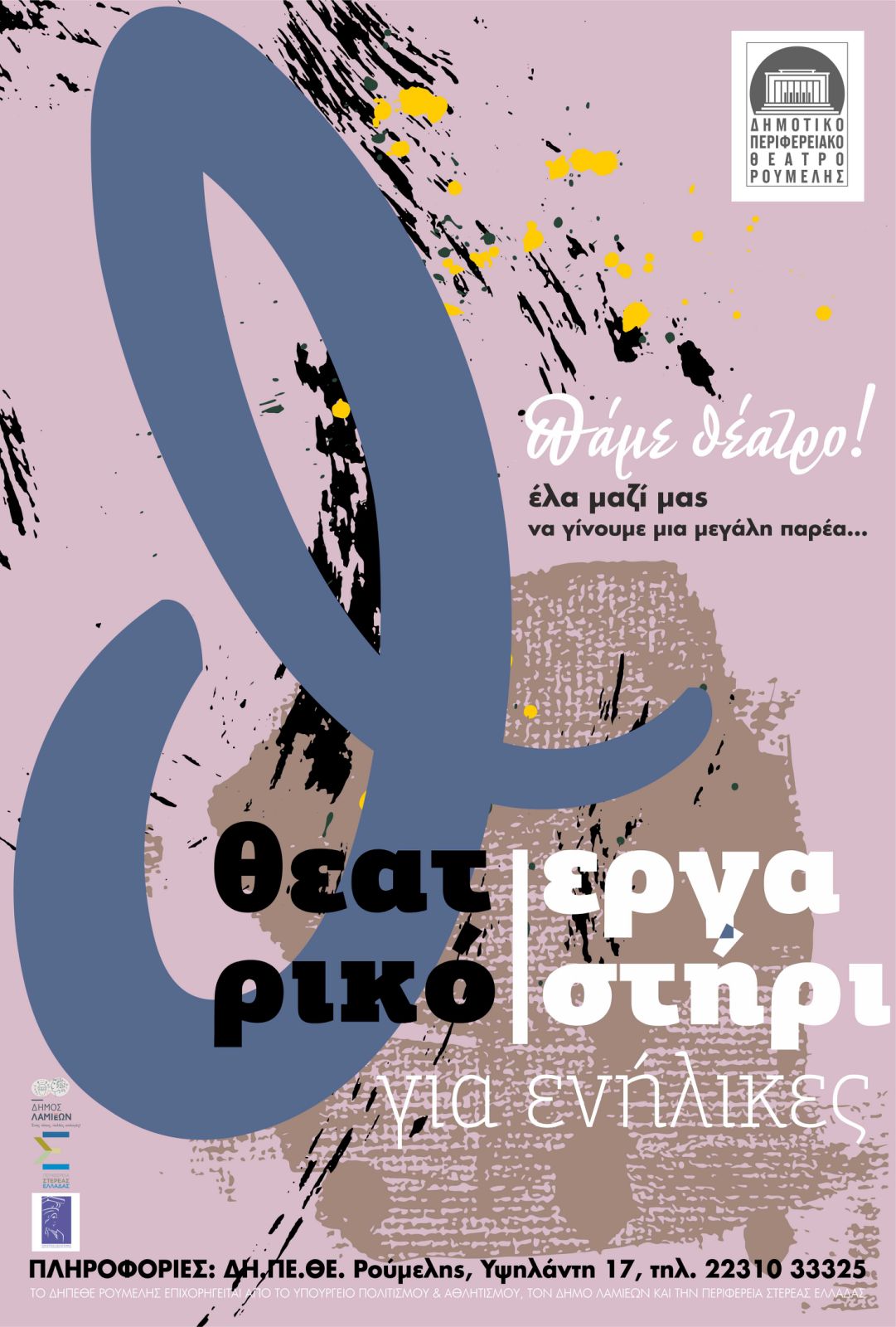Το ΔΗΠΕΘΕ Ρούμελης ανακοινώνει με χαρά την έναρξη νέου κύκλου εργαστηρίων θεατρικής έκφρασης για ενήλικες. Τα εργαστήρια απευθύνονται σε όλους όσοι επιθυμούν να γνωρίσουν τον κόσμο του θεάτρου, να εκφραστούν δημιουργικά και να ανακαλύψουν νέες πτυχές του εαυτού τους. Με τη