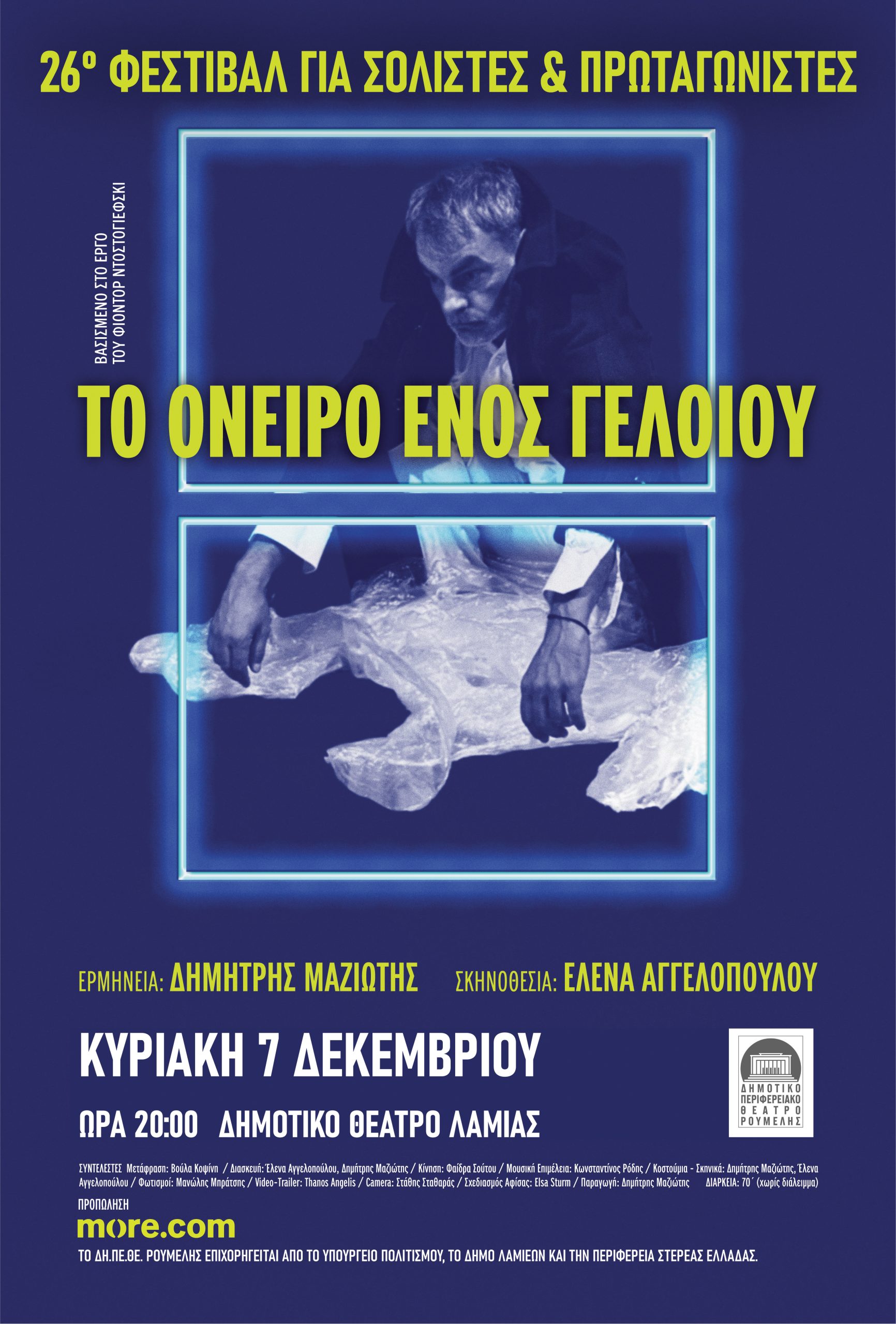 Το 26ο Φεστιβάλ για Σολίστες & Πρωταγωνιστές, που διοργανώνει το ΔΗ.ΠΕ.ΘΕ. Ρούμελης, συνεχίζεται δυναμικά με μια ακόμη μεγάλη θεατρική στιγμή. Την παράσταση «Το Όνειρο ενός Γελοίου», βασισμένη στο ομώνυμο έργο του Φιοντόρ Ντοστογιέφσκι, την Κυριακή 7 Δεκεμβρίου, στις 20:00, στο Δημοτικό Θέατρο Λαμίας. Η